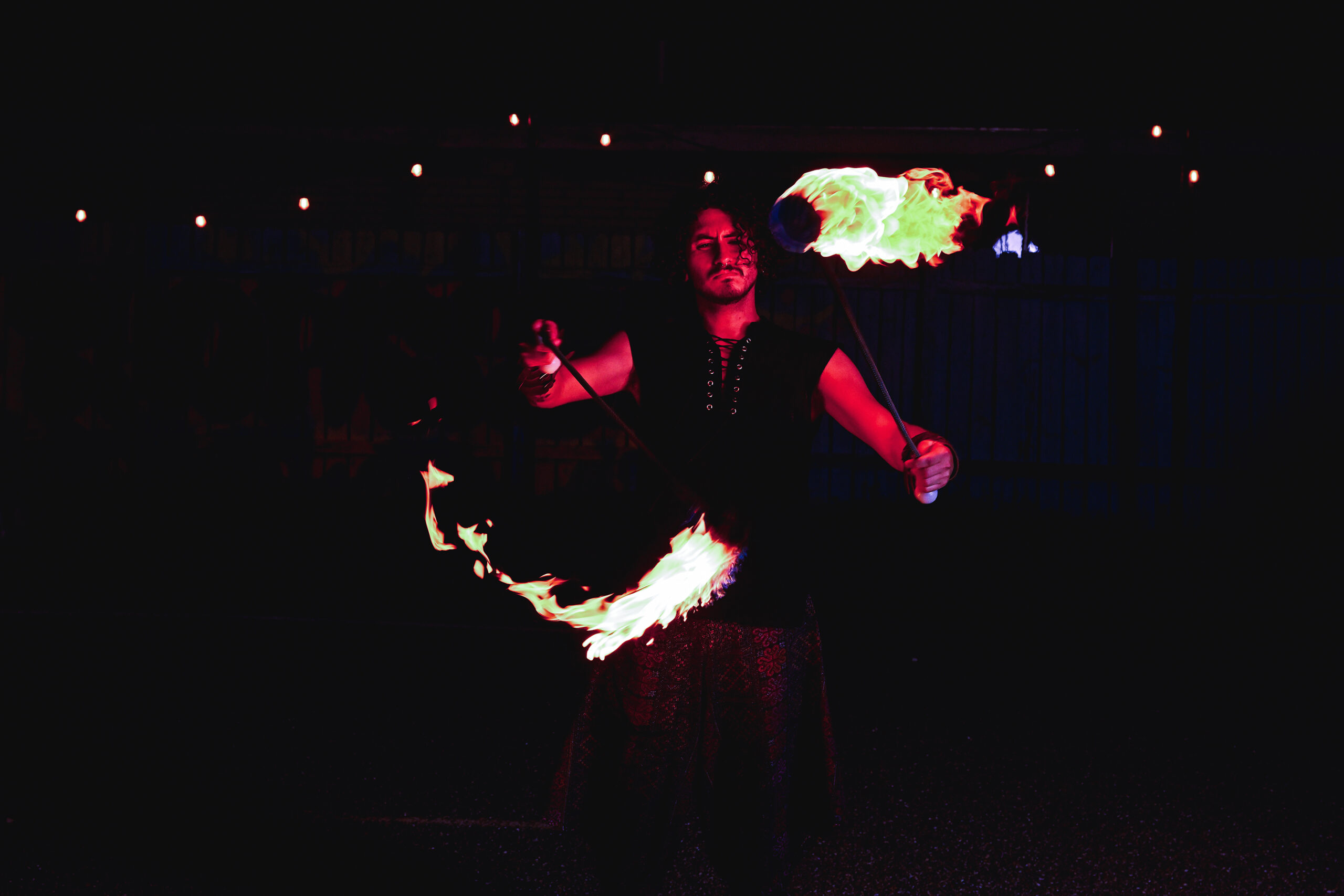 Standing grounded under the night sky, Lane spins flames that seem to move with intention. Every gesture carries rhythm and control, born from years of practice and respect for danger.